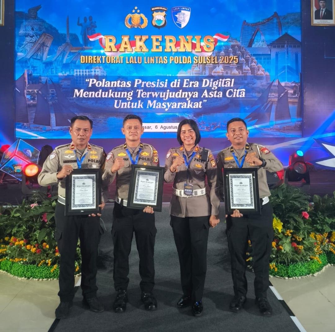 Barru, Sulsel โ Satuan Lalu Lintas Polres Barru meraih tiga penghargaan dari Direktur Lalu Lintras Polda Sulsel pada pelaksanaan Rakernis Direktorat Lalulintas Tahun 2025 yang digelar di Aula Mappoudang Polda Sulsel, Rabu (06/08/2025).