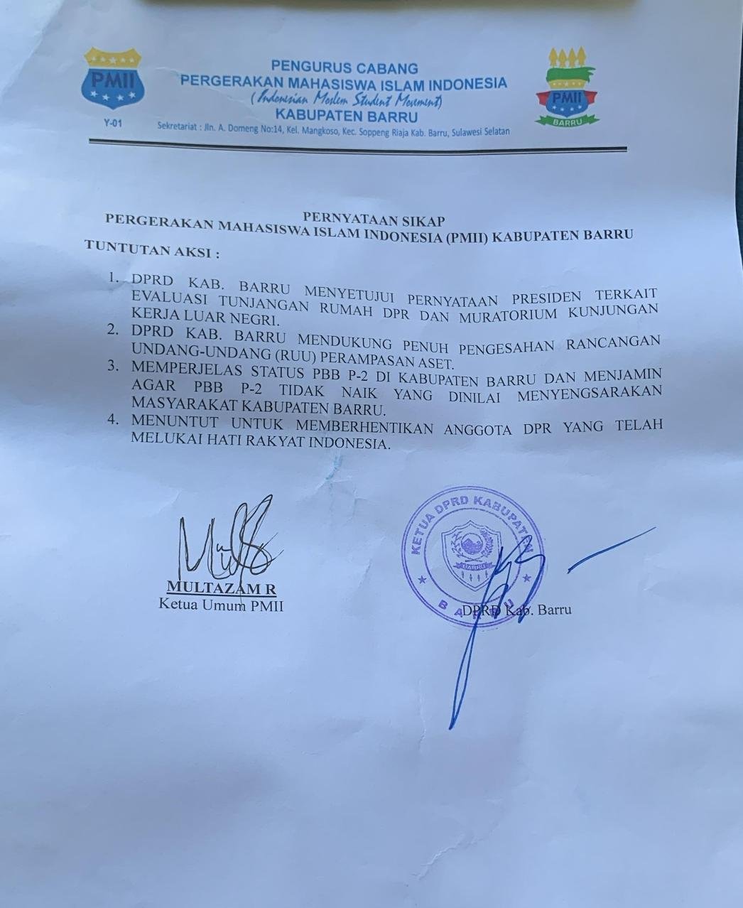 Barru, Sulsel – Ketua DPRD Barru, Syamsuddin Muhiddin, menandatangani nota kesepahaman dengan massa aksi dari Persatuan Mahasiswa Islam Indonesia (PMII) pada Selasa (2/9). Nota kesepahaman tersebut berisi beberapa poin penting yang menjadi tuntutan massa aksi.